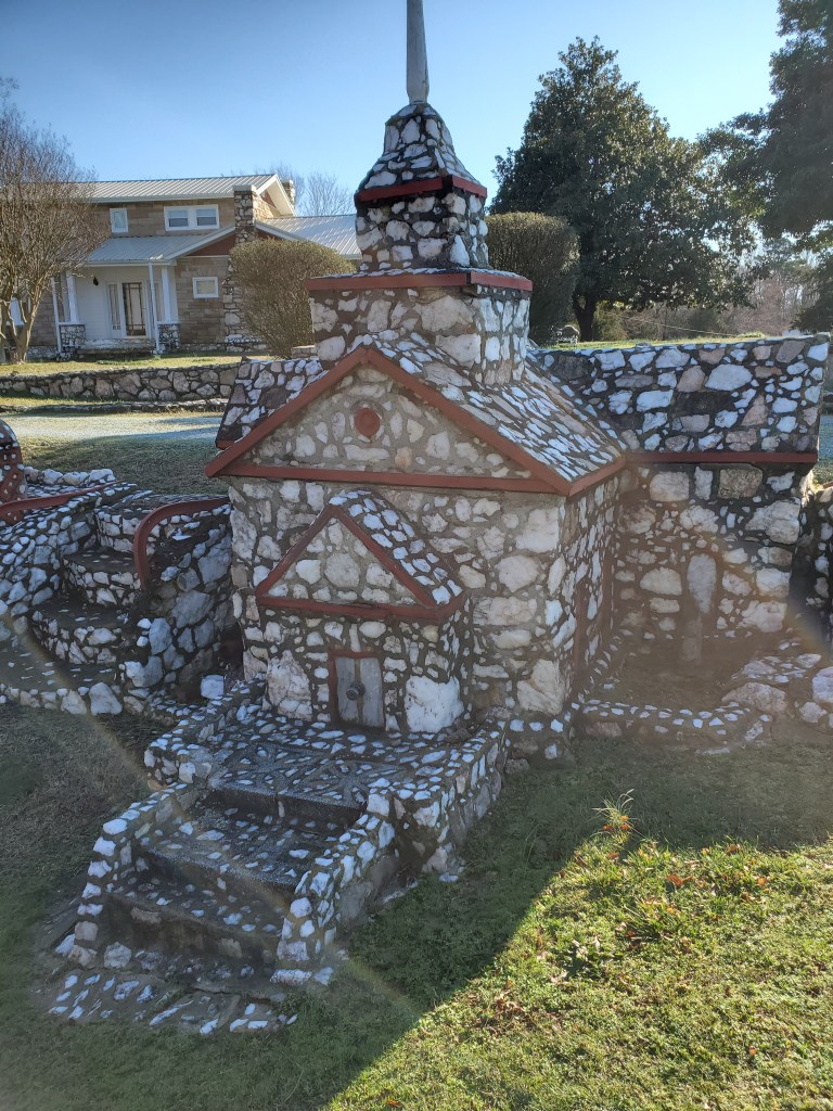 My first stop was a place I’ve been excited to see since I first heard about it–the Shangri-La Stone Village in Prospect Hill, NC. This little gnome-sized village was built by retired tobacco farmer Henry Warren in the last years off his life, from 1968-1977. In all, he built 27 unique stone structures in his side yard, and it has been a visitor attraction since. They’ll often get several visitors per day!